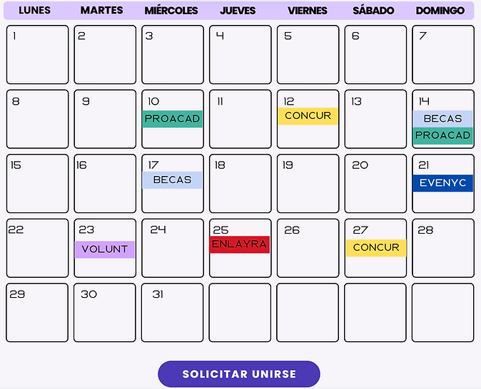 En esta sección encontrarás un calendario colaborativo, creado y actualizado por estudiantes de la comunidad. Puedes consultarlo fácilmente y unirte a los eventos directamente desde tu cuenta de Google Calendar. Mantente al día con actividades, talleres y fechas importantes compartidas por tus compañeros.